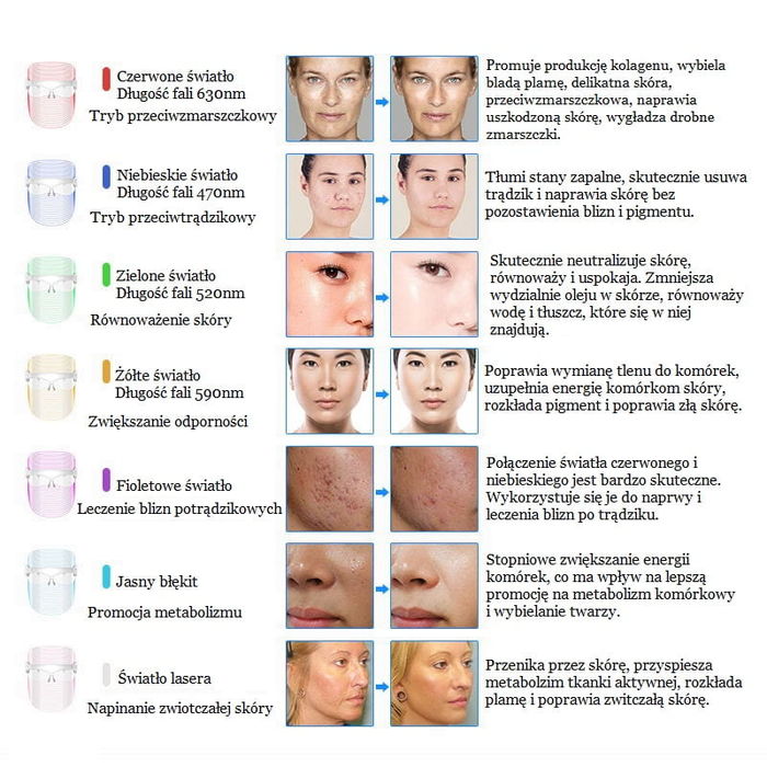 następnie nakładana jest maska na czas określony pod względem probelmu skórnego jest to od 5 do nawet 15min. Zabieg konczy krem nawilzajacy. Maska automatycznie wyłączy się po 15 min.